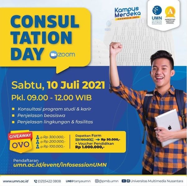 UMN Consultation Day ini akan dilangsungkan secara online yang bisa kamu ikuti #darirumahaja ! Jadi buat kamu yang mau lihat langsung kampus UMN atau kamu yang berasal dari luar kota tetap bisa ikut acara ini😉 Psstt.. ada juga UMN Consultation Day Offline ya Sahabat UMN!